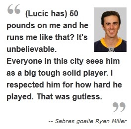 This whole Lucic thing from the other night is killin’ me. I follow hockey and am a huge Bruins fan, but basketball is definitely my “go-to” winter sport. So stop me if I’m wrong, but don’t hockey players pride themselves in how much tougher they are than any other athlete? Although not how I’d state it, I definitely do respect hockey players for that aspect of the game. That being said, how can Ryan Miller come out and complain about a hit that resulted in a minor penalty. Did he think he could come about 20 feet out of the net to try and stop a Lucic breakaway without suffering the consequences? I love the mentality of playing tough and physical in any sport if you want to win. Since Miller came well out of his crease to play the puck like a defender, he’s going to get treated like a defender, especially with the Looch coming at you. Anyways, Lucic has a hearing with the NHL today at 1pm to determine if they’ll be any consequences for the hit. With the NFL implementing all these new hitting rules, I’ll be disappointed in the NHL as well if they make a big deal out of this. Never more fitting than in this situation…It’s just part of the game. NO EASY BUCKETS!