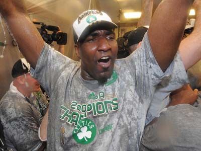 BOSTON – JUNE 17: Kendrick Perkins #43 of the Boston Celtics celebrates after defeating the Los Angeles Lakers during Game Six of the NBA Finals at the TD Banknorth Garden on June 17, 2008 in Boston, Massachusetts. NOTE TO USER: User expressly acknowledges and agrees that, by downloading and or using this photograph, User is consenting to the terms and conditions of the Getty Images License Agreement. Mandatory Copyright Notice: Copyright 2008 NBAE (Photo by Brian Babineau/NBAE via Getty Images)