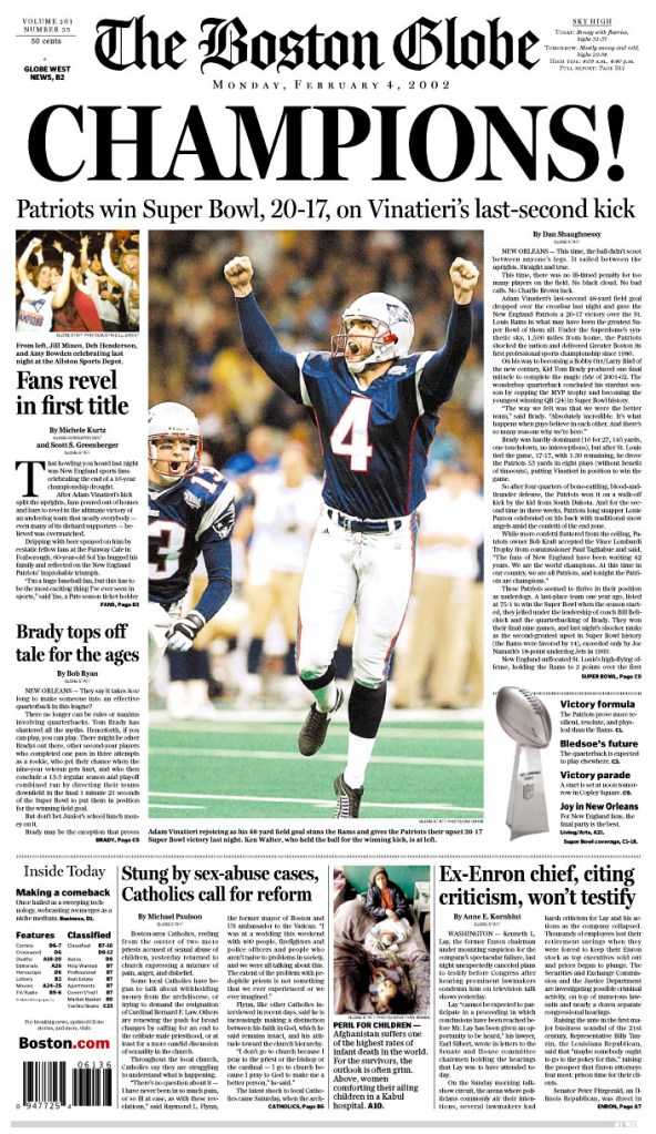 Boston Globe Published November 1, 2012 at 706 × 1221 in Throwback Thursday – Patriots’ First Superbowl Win