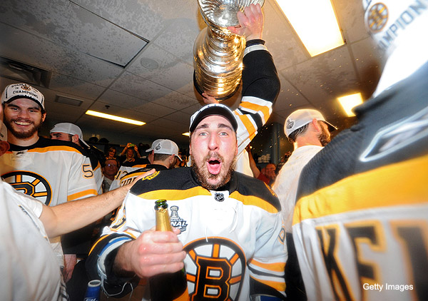 VANCOUVER, BC – JUNE 15: Brad Marchand #63 of the Boston Bruins celebrates in the locker room after defeating the Vancouver Canucks in Game Seven of the 2011 NHL Stanley Cup Final at Rogers Arena on June 15, 2011 in Vancouver, British Columbia, Canada. The Boston Bruins defeated the Vancouver Canucks 4 to 0. (Photo by Harry How/Getty Images)