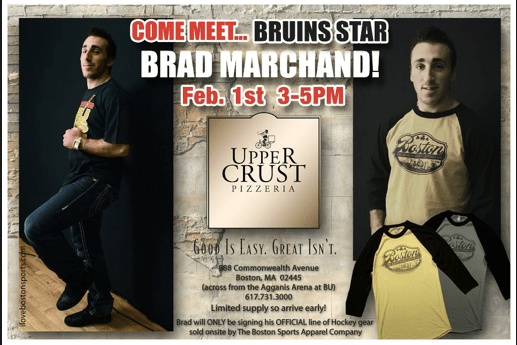 Remember to come join us tomorrow at the Brad Marchand signing event!! February 1st from 3-5pm at Upper Crust on the BU Campus at 888 Comm Ave, right across from the Agganis Arena.